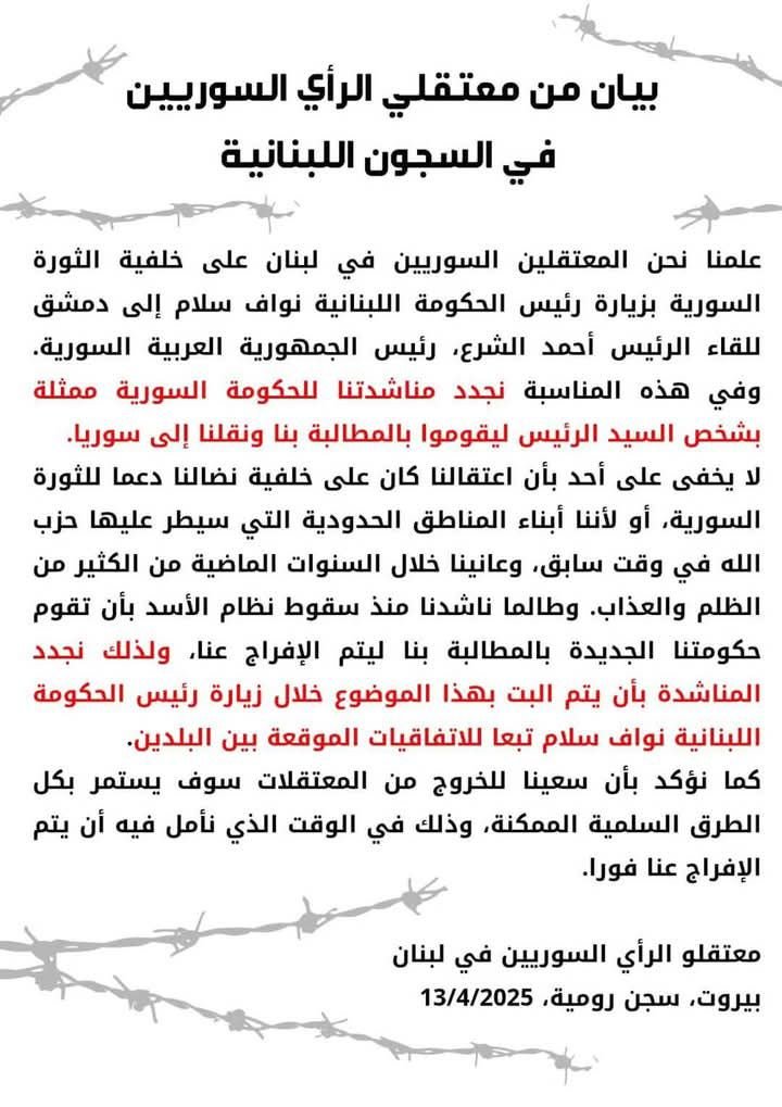 وأكد المعتقلون في بيانهم أنهم علموا بالزيارة المرتقبة لرئيس الحكومة اللبنانية إلى دمشق، حيث سيلتقي الرئيس السوري أحمد الشرع، وتوجهوا بمناشدة للسيد رئيس الجمهورية السورية للعمل على الإفراج عنهم.