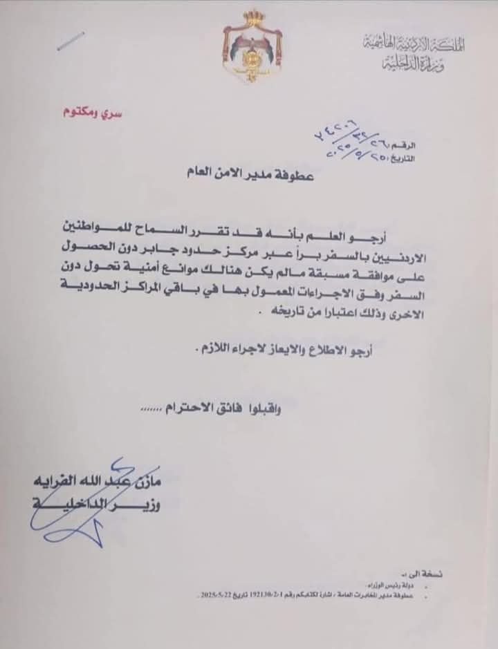 أصدر وزير الخارجية الأردني، مازن الفراية، قراراً يقضي بالسماح للمواطنين الأردنيين السفر براً إلى سوريا، عبر مركز حدود جابر دون الحصول على موافقة مسبقة.