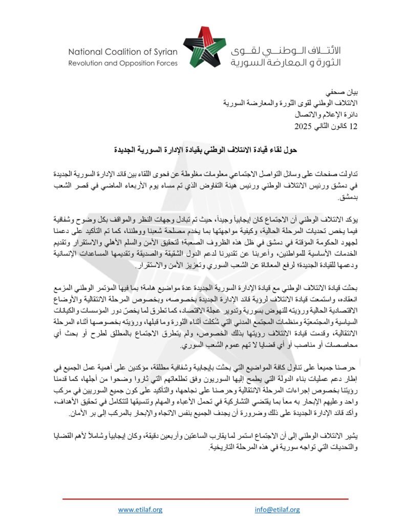 بيان الائتلاف أوضح أنه تم خلال اللقاء تبادل وجهات النظر والمواقف بكل وضوح وشفافية فيما يخص تحديات المرحلة الحالية وكيفية مواجهتها بما يخدم مصلحة الشعب السوري، مؤكداً في الوقت ذاته على دعم جهود الحكومة المؤقتة في دمشق في ظل هذه الظروف الصعبة لتحقيق الأمن والسلم الأهلي، وتقديم الخدمات الأساسية للمواطنين.