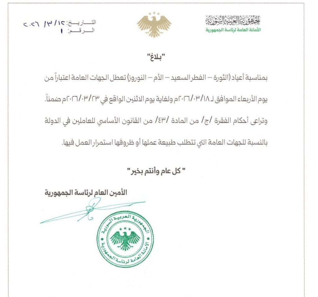 أعلنت الأمانة العامة لرئاسة الجمهورية تعطيل الجهات العامة بمناسبة أعياد الثورة والفطر والأم والنوروز بدءاً من يوم الأربعاء القادم 18 آذار وحتى يوم الإثنين 23 آذار، على أن يستثنى من ذلك الجهات التي تقتضي ظروفها وطبيعة عملها الاستمرار في تقديم الخدمات أثناء فترة العطلة.