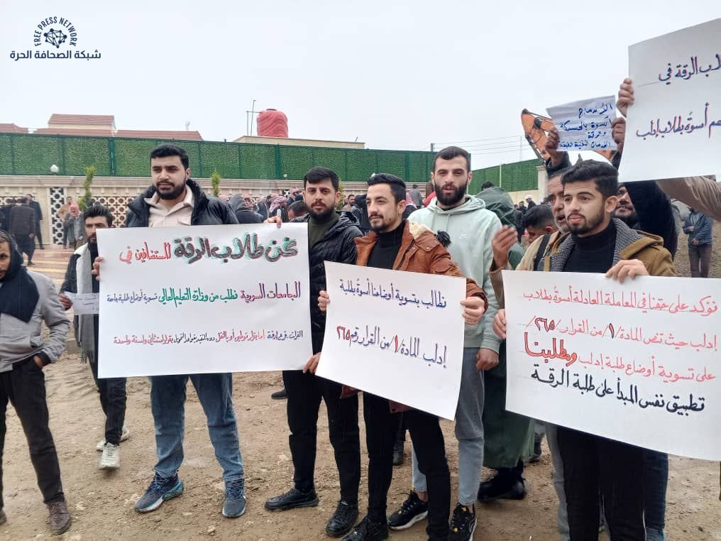 نظّم مجموعة من طلاب جامعة الفرات من أبناء محافظة الرقة، والمستضافين حالياً في جامعات سورية مختلفة، وقفة احتجاجية أعربوا خلالها عن تمسكهم بحق التوطين الدراسي في الجامعات التي يتابعون فيها تحصيلهم العلمي حالياً.