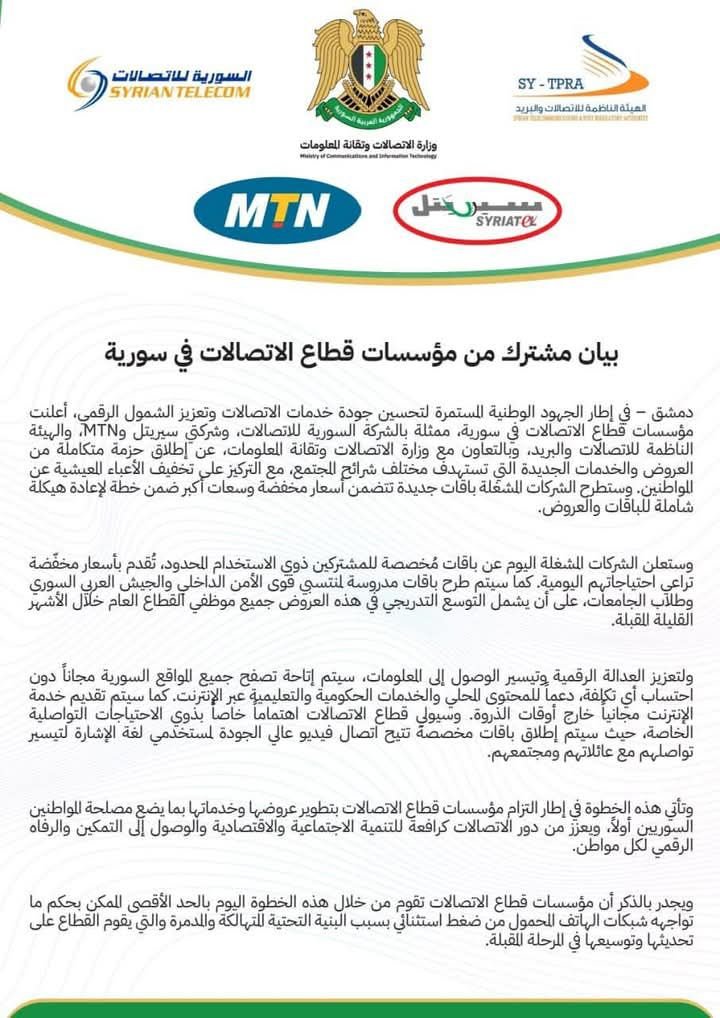 من جهتها أصدرت مؤسسات قطاع الاتصالات السورية بياناً مشتركاً، ممثلة بالشركة السورية للاتصالات، وشركتي سيريتل وMTN، والهيئة الناظمة للاتصالات والبريد، وجاء ذلك بالتعاون مع وزارة الاتصالات وتقانة المعلومات، أعلنت فيه عن حزمة من الخدمات.