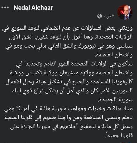 في سياق متصل، أعلن وزير الاقتصاد السوري، نضال الشعار، عبر منشور على “فيسبوك”، عن عزمه زيارة الولايات المتحدة الشهر القادم، على أن تشمل زيارته العاصمة واشنطن وولايات ميشيغان، تكساس، وكاليفورنيا.